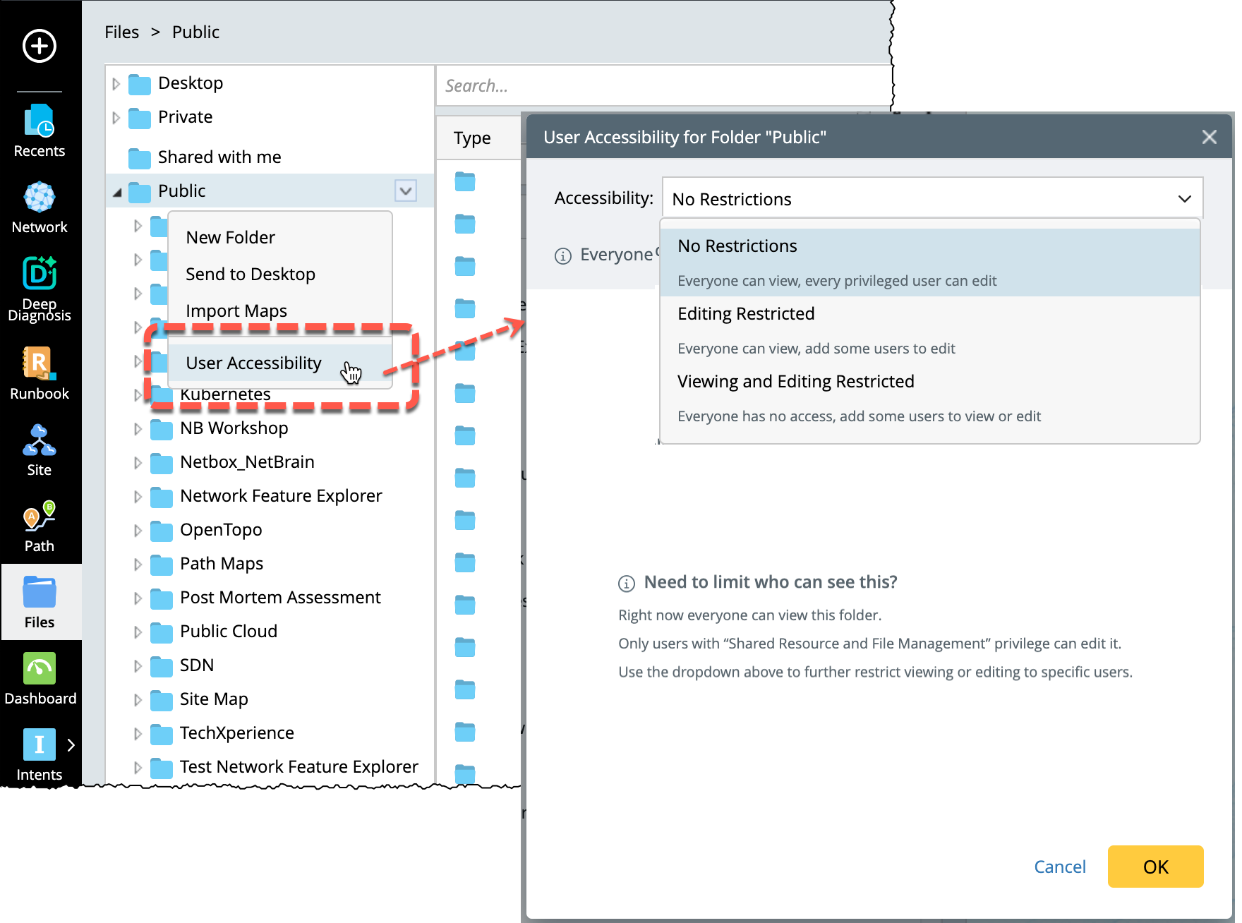 You can control who can view and edit folders, maps, and files using the User Accessibility wizard. Three configuration options are available to define accessibility settings.