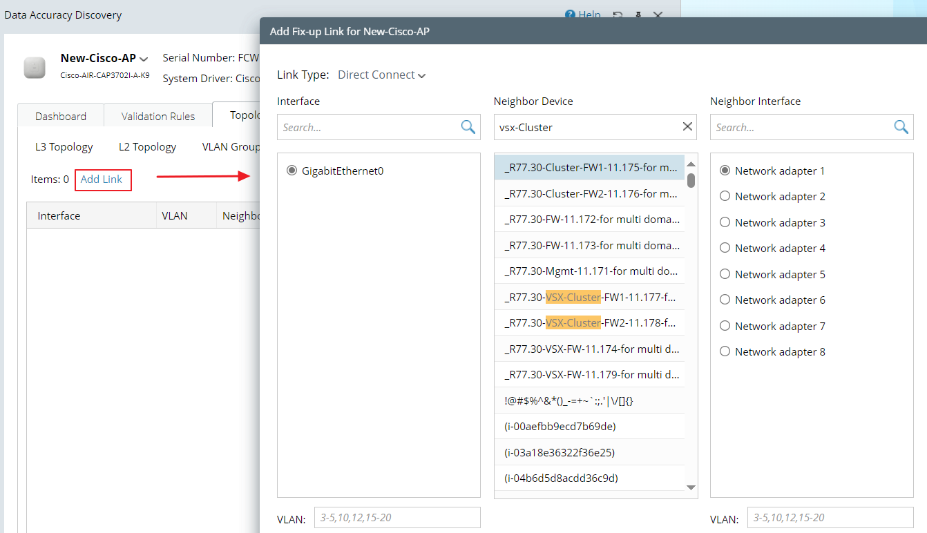 - On the Data Accuracy Discovery window, click the Topology tab and then click VLAN Fix-up Link.