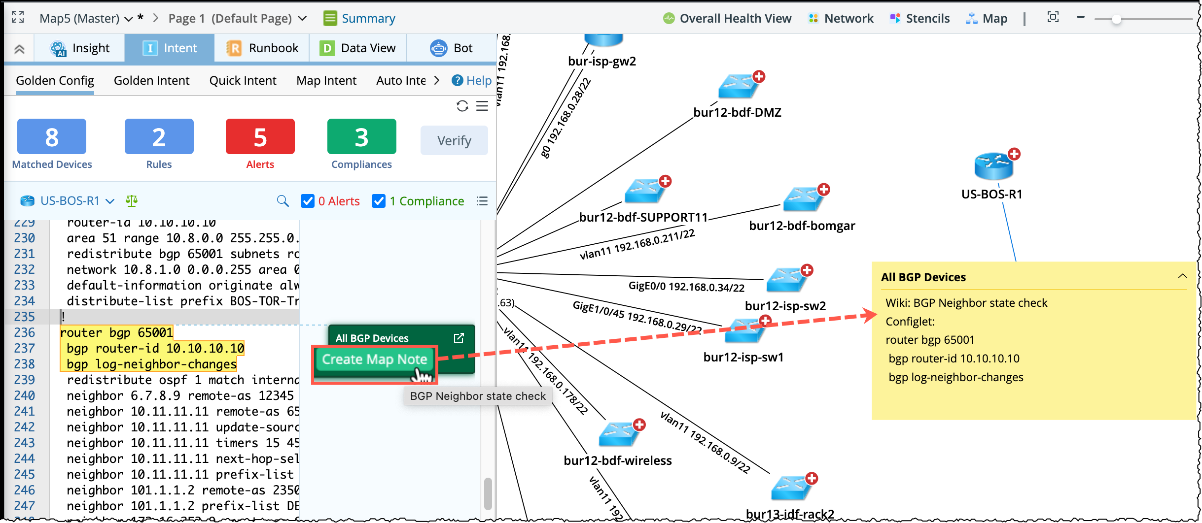 Create Map Note: A device note can be created on the map to show the Golden Config Rule name, Design Wiki, alert message, and a message for generated compliance results. If the device is not on the map yet, it will be automatically drawn on the map before adding the device note.