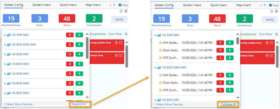Note: The tip window from Alerts block will only list the golden config rules and devices that generate at least one alert.
