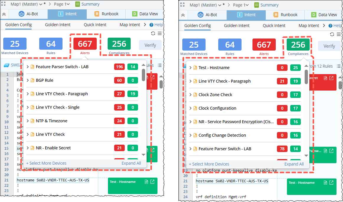 Alert and Compliance blocks: It is the count of Alerts (indicated by red color) and the count of Compliance (indicated by green color) from all the Golden Config Rules. In the tip window, under each rule it displays the devices matched with the rule and its corresponding golden check results.