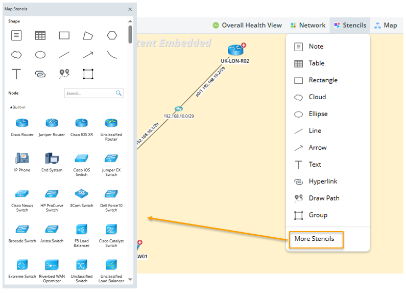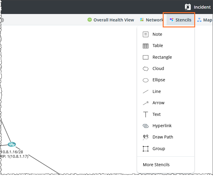 To enhance map interactivity or add contextual information, use the Stencils feature. Stencils allow you to insert visual elements such as shapes, text, tables, and device icons directly onto the map. These elements can help document or organize your network layout more effectively.