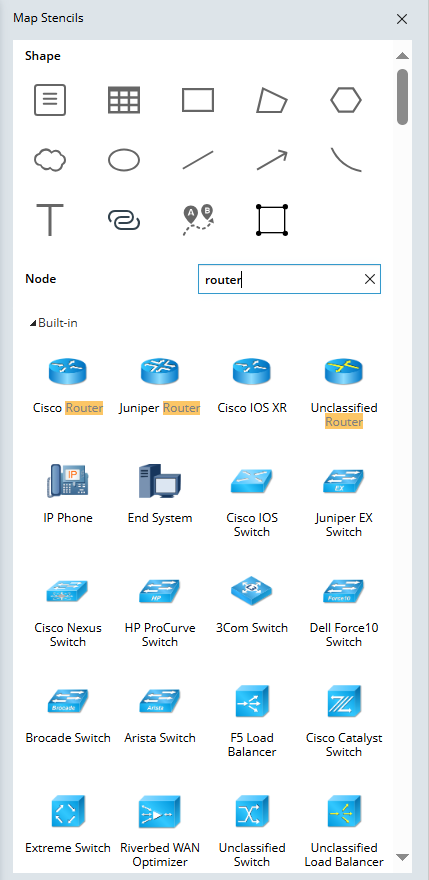 - Select a shape to draw directly on the map, or drag a device icon from the Node category onto the map.