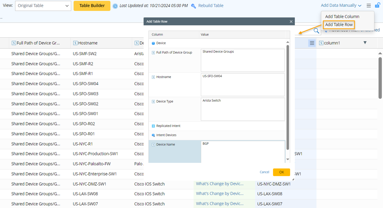 - Click OK in the Add Table Row dialog to finish manually adding table row data.
