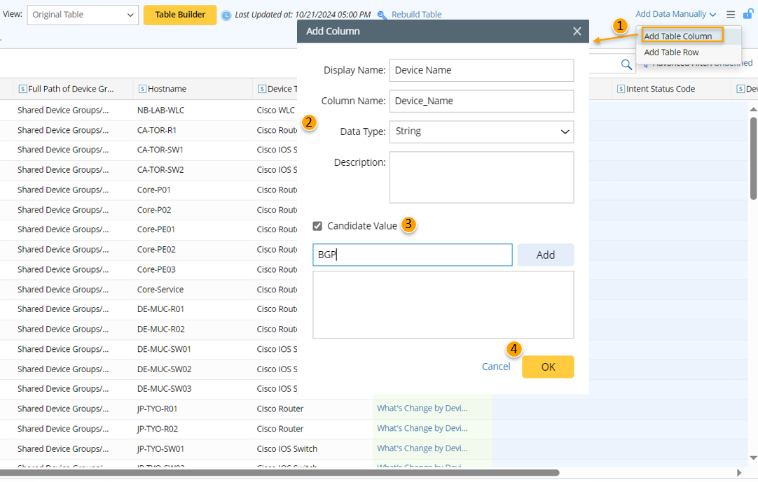 - Select the target ADT in the ADT Manger, then click Add Data Manually > Add Table Column.