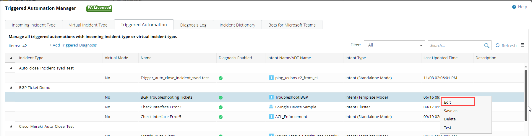 In Triggered Automation Manager, right-click triggered automation and select Edit from the drop-down list.