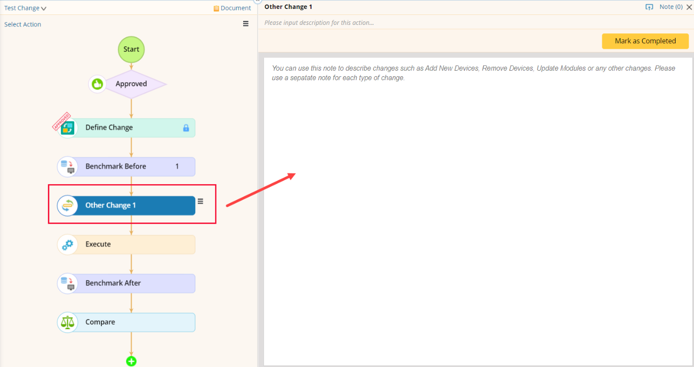 The Other Change node provides a note function to remind the change executor of extra operations, such as discovering new devices to the domain, removing devices from the domain and updating modules beyond the change management task.