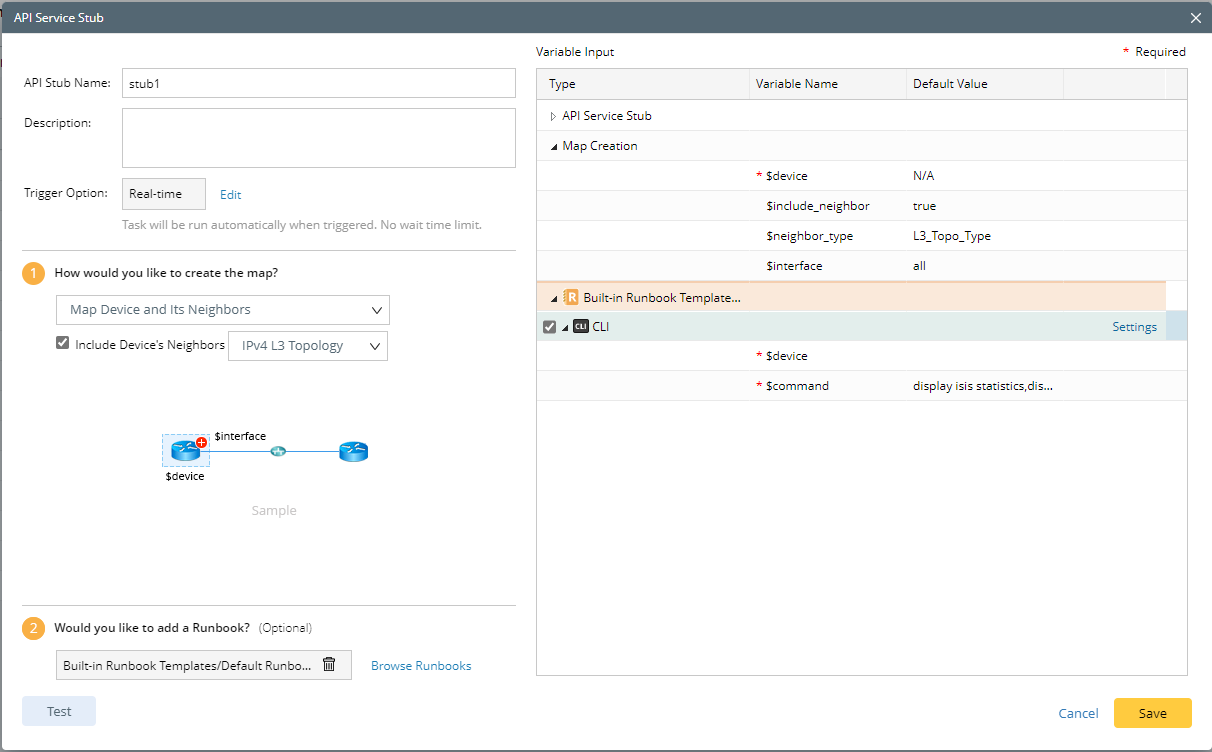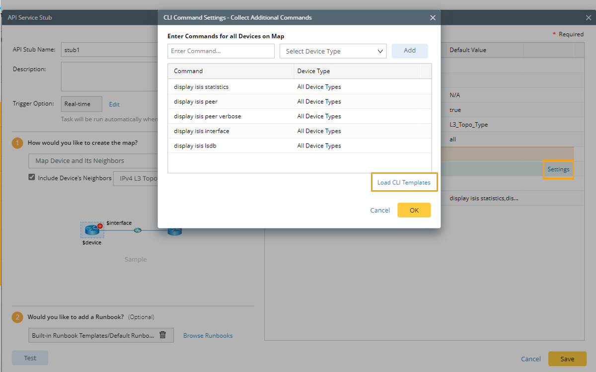If you have selected a Runbook to add to the API Service Stub in Step 8, you can configure the CLI command settings in the Variable Input pane by clicking Settings and configuring the CLI command settings in the pop-up dialog box.