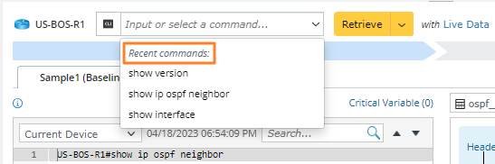 Note: To input commands more conveniently and quickly, the Netbrain system provides command lists under different data sources and prompts based on the characters entered by you. Two categories of commands can be listed in the intelligent prompt: Historical commands and Recent commands entered by the user during live access.
