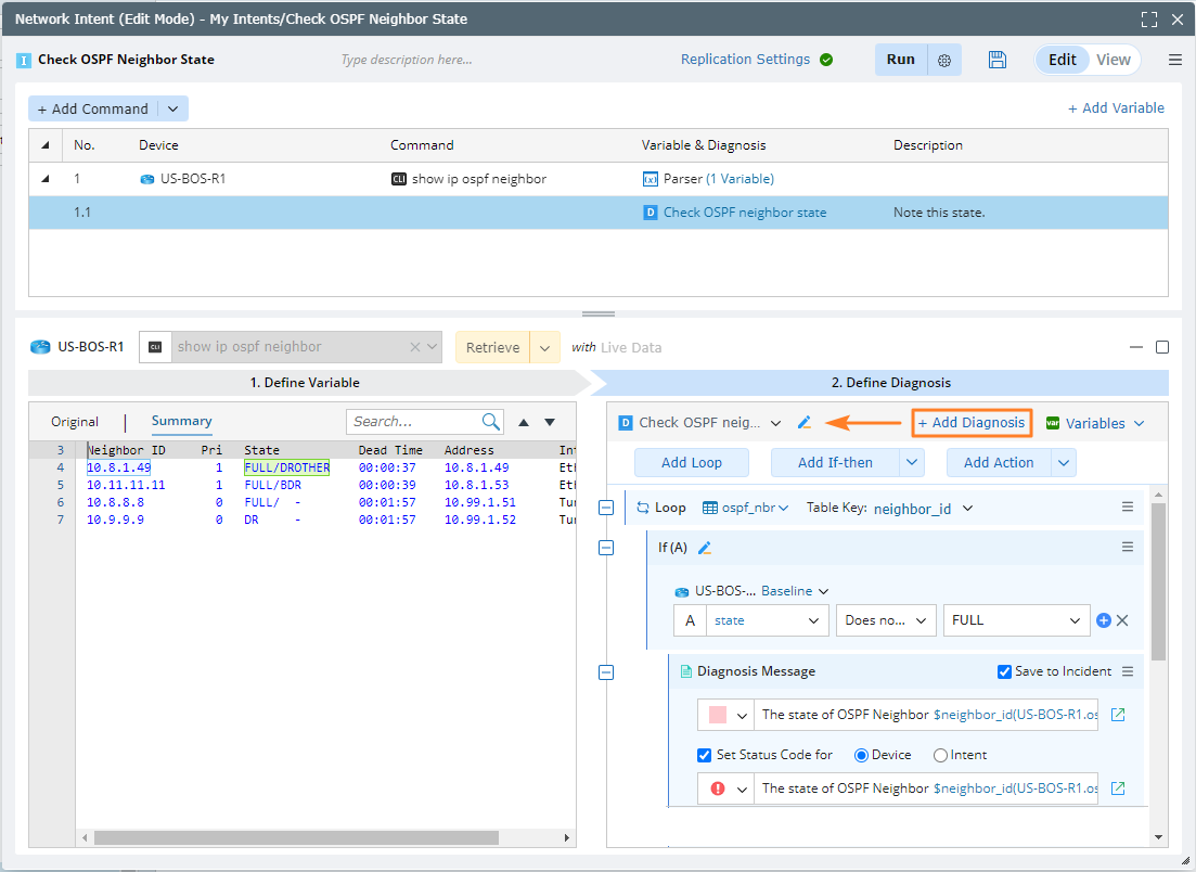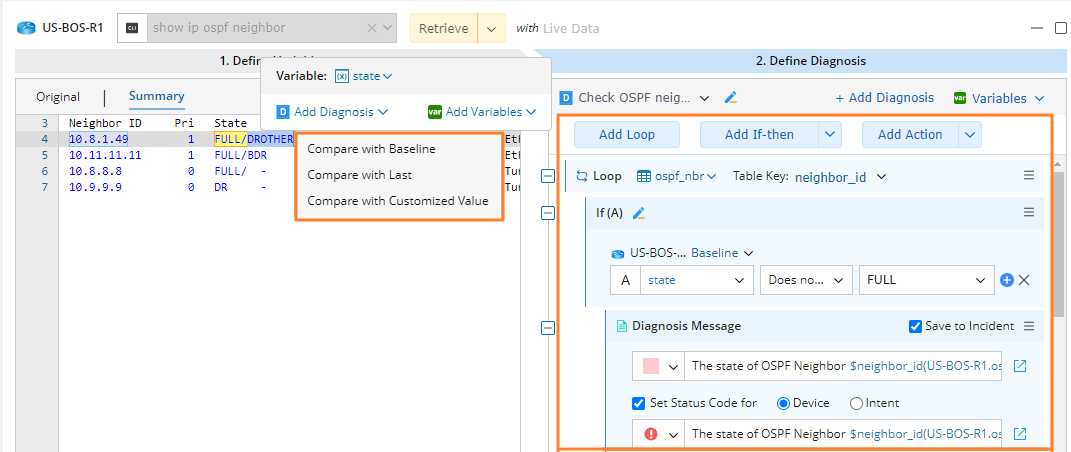 Diagnosis is the most critical component of NI. You can define the logic of validating and verifying the network design in Diagnosis and create diagnosis notes. A common diagnosis is as simple as: if the variable is not equal to a specific value (the baseline value) and then creates a diagnosis note. Status code describes NI execution results (Alert or Success). You can also directly add a diagnosis with template.