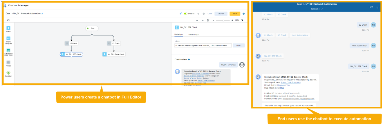 Chatbot allows power users to build interactive, multi-step chatbots, so end users can execute multiple intent-based automation to solve real-world challenges without accessing NetBrain system UI. Using a chatbot doesn’t require NetBrain know-how or any seat license.