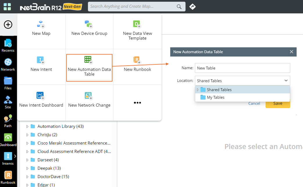1. Go to the   menu, then click New Automation Data Table widget. In the popup dialog, define table name and select location to store the table.