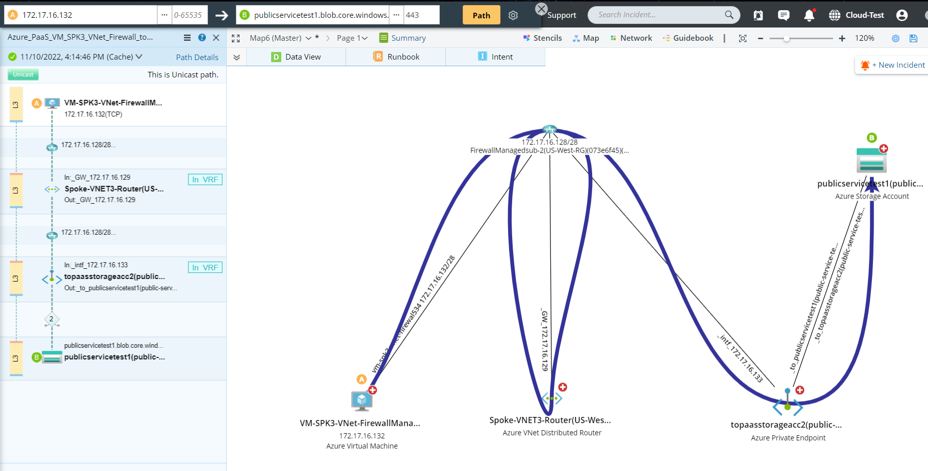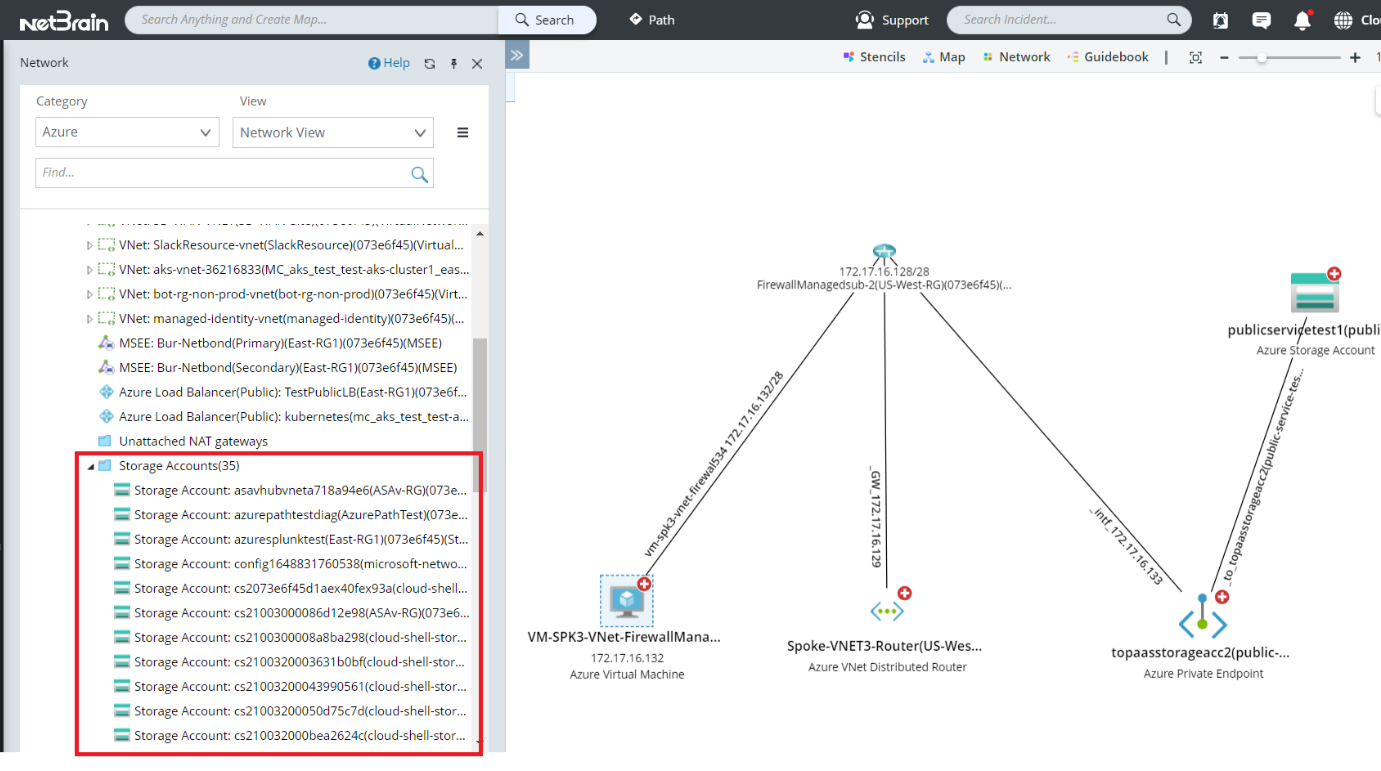 Azure Platform as a Service (PaaS) provides a framework that developers can build on to develop or customize a variety of cloud-based applications. NetBrain can show the visibility about various PaaS services like database and topology between different Service Endpoint, Private Endpoint and various PaaS services. Also, the path feature can show the end-to-end traffic flow hop by hop from Azure or On-Prem server to the destination PaaS service, which can be used for issue troubleshooting and network traffic analysis, planning, and optimization.