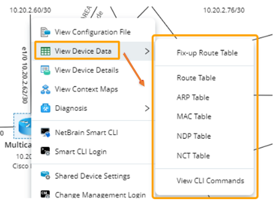Also, you can browse the following device data from the right-click menu on a device and select View Device Data to learn the network design or troubleshoot network problems.