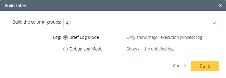 - Click Save and Build. The Build Table dialog appears, define the settings as per your preferences. The system will save the settings and build the table data.