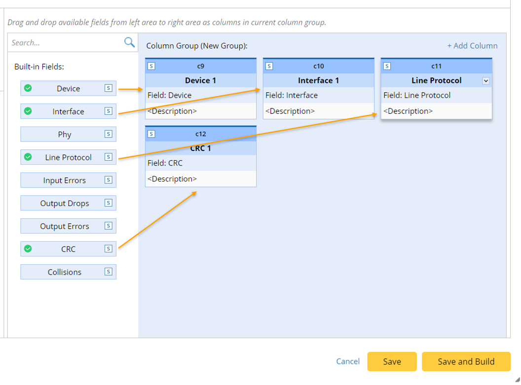 - Mapping Available Fields in CSV to Column Group: Drag and drop the available fields to the column group definition area to create ADT columns automatically. The columns of the imported CSV will serve as available field for building the current column group.