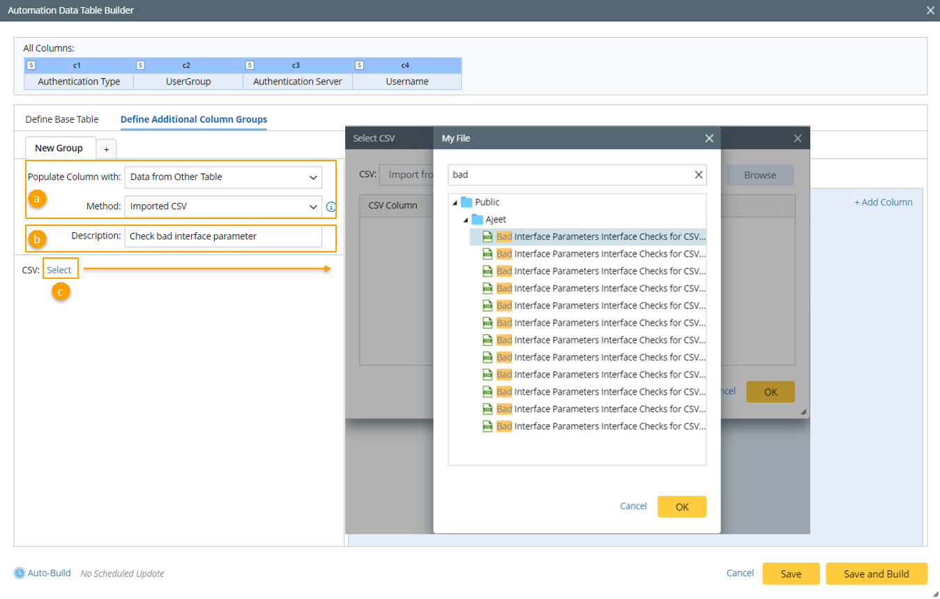 - Select Method to build column group: Select Data from Other Table > Imported CSV.