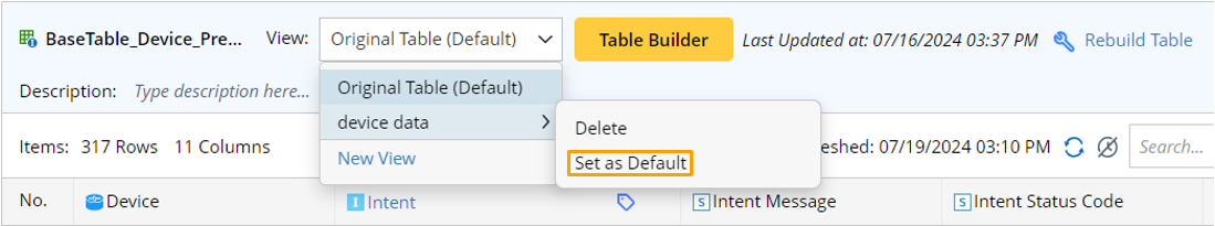 - One of the views (including the original table) can be set as default. The default one will be marked by ‘Default’ in the View list.