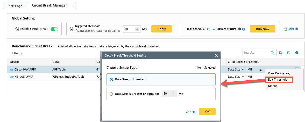 For example: If the data size for the routing table of the core router is larger than the default Circuit Break threshold. But, still want to get data in the Server Benchmark, it can be achieved by modifying the thresholds.