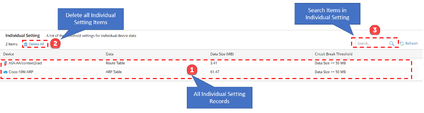 All manually changed threshold settings will be recorded in the Individual Setting table with the following features: