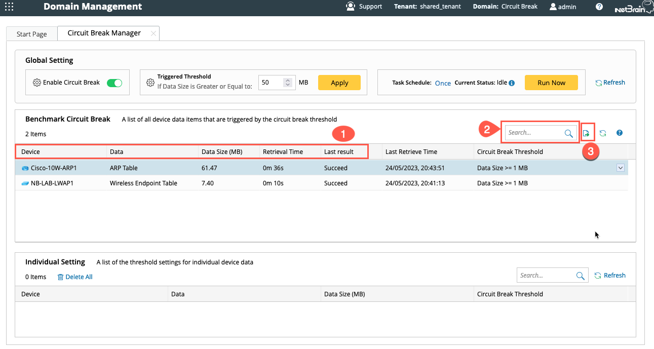 Note: The Circuit Break Benchmark will also perform Circuit Break checking on the collected data items and refresh the Circuit Break Table.