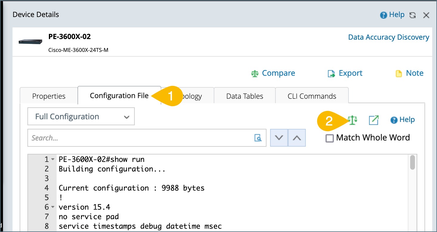 - In the Device Details pane, select the Configuration File tab. The full configuration file of the device is displayed by default.
