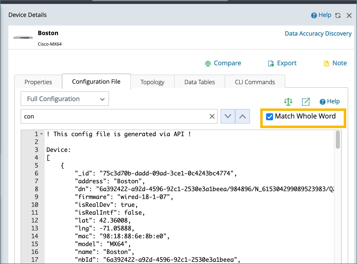 - In the Device Details pane, select the Configuration File tab. The full configuration file of the device is displayed by default.