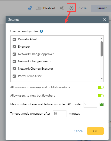 - Max number of executable intents on last ADT node: When an ADT node is the last node in the chatbot, it supports numerous (1-50) intents to execute. You can set the maximum allowed number of intents. The default number is 5.
