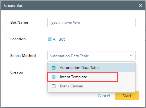 - Select Intent Template. Click Start. See Create Chatbot from Intent Template for details.