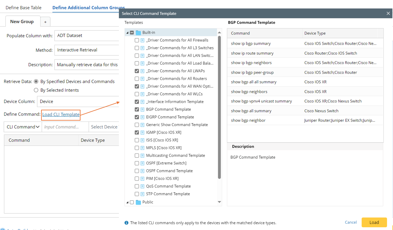 - Define command: Click Load CLI Template to specify the command templates finally displayed in ADT dataset.