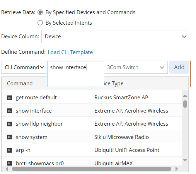 - By Specific Devices and Commands: Define the CLI commands and applicable device types. During manual data retrieval, the command data will be obtained per device based on the corresponding device type.