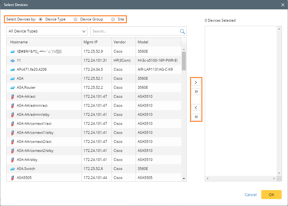 - Specify the device scope by selecting Device Type, Device Group, or Site.
