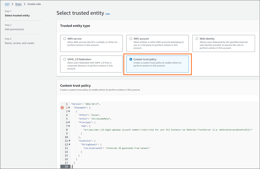 Note: The EC2 instance role name, such as NetbrainAccessRoleForEC2, must match the role name configured in the gateway account. Code"Version": "2012-10-17",