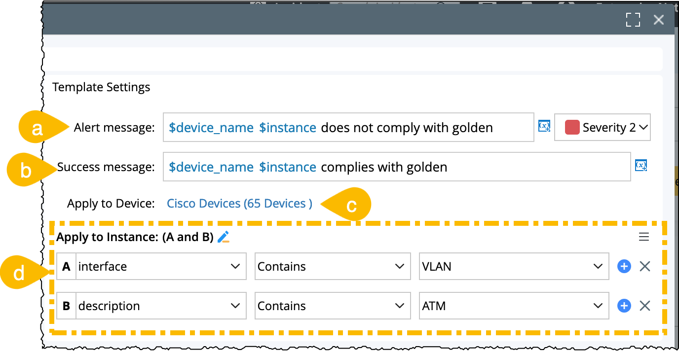 - Template Settings: In the Template Settings, user can define the Alert Message, Success Message, applicable device groups, and applicable instance condition for the current Golden Config Template.