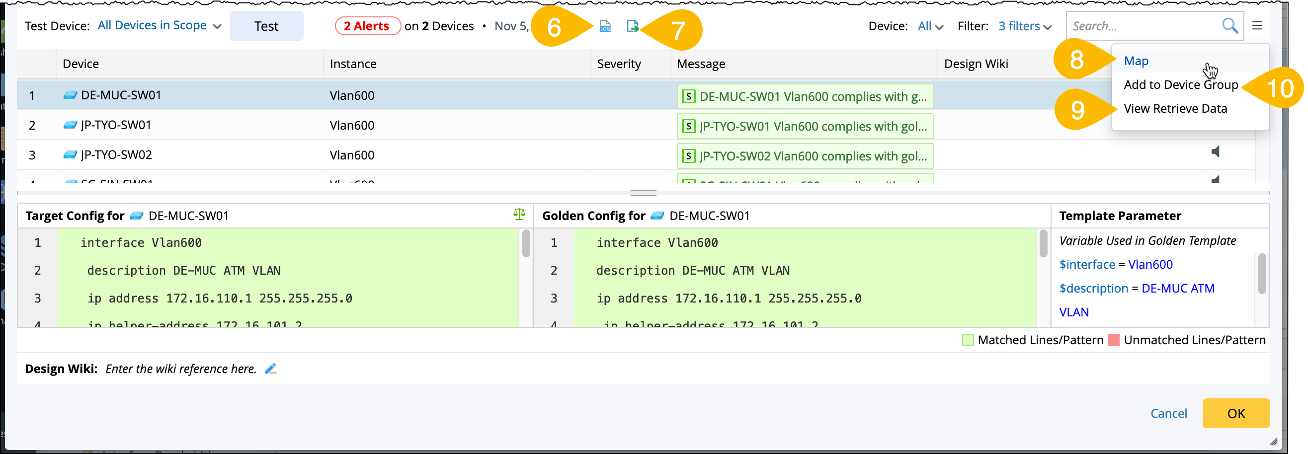 View Test Results: Select an item from the results to display the matching patterns between Target Config and Golden Config computed for the device.