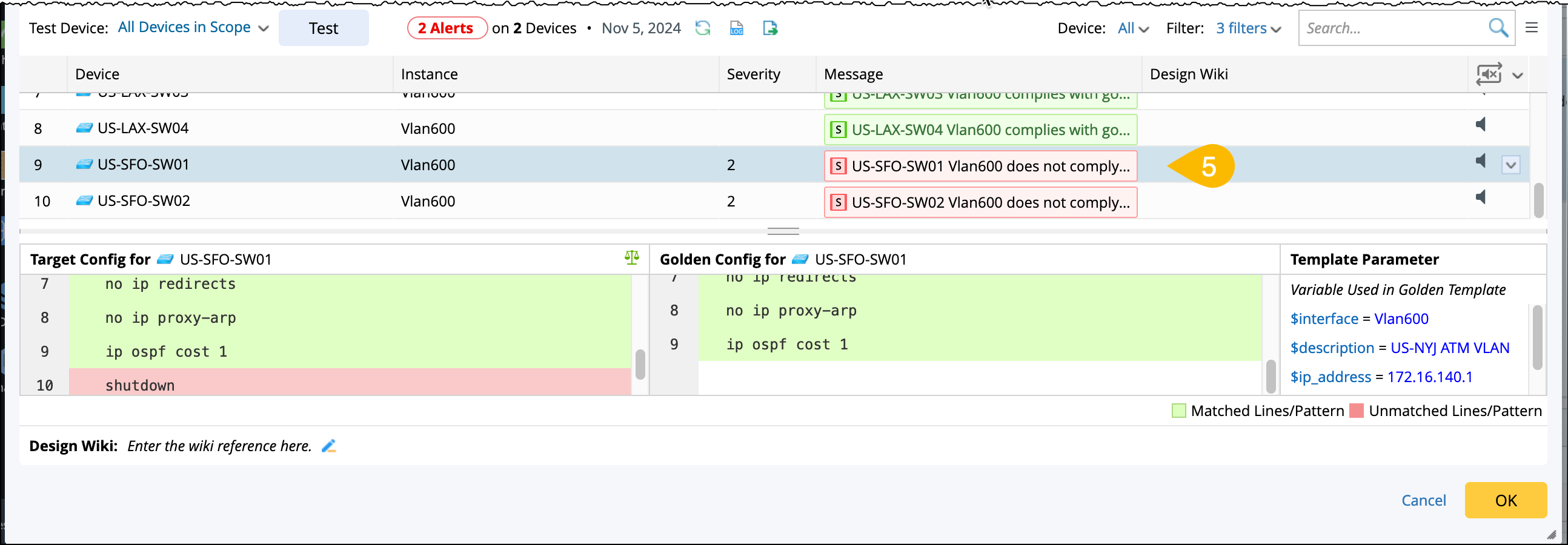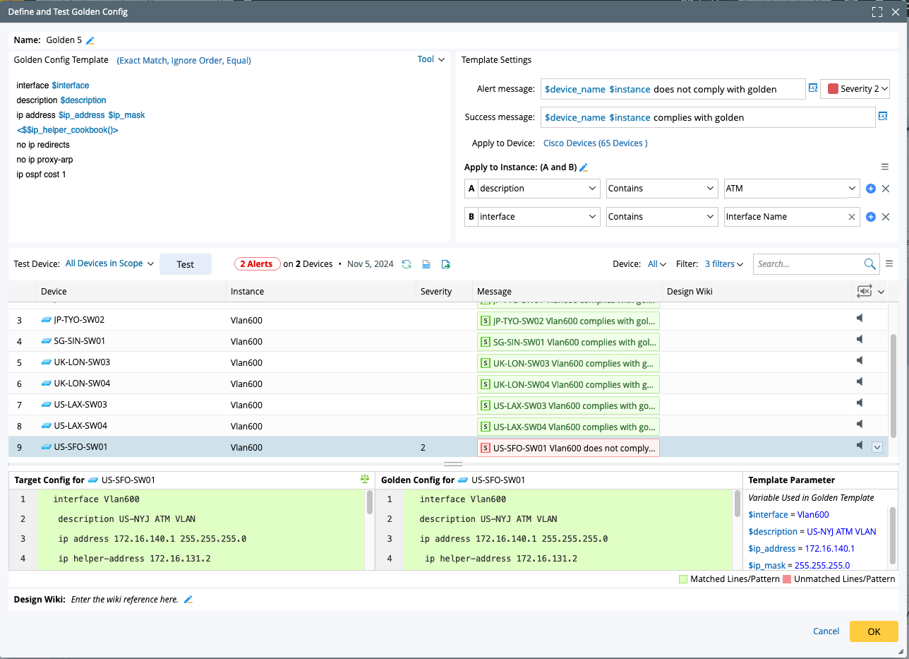 - Match Pattern: Define the pattern to compare target config against the golden config template. The functionality is same as in NI.