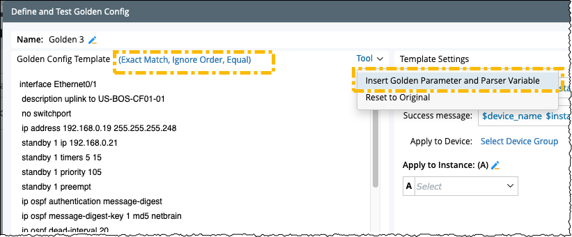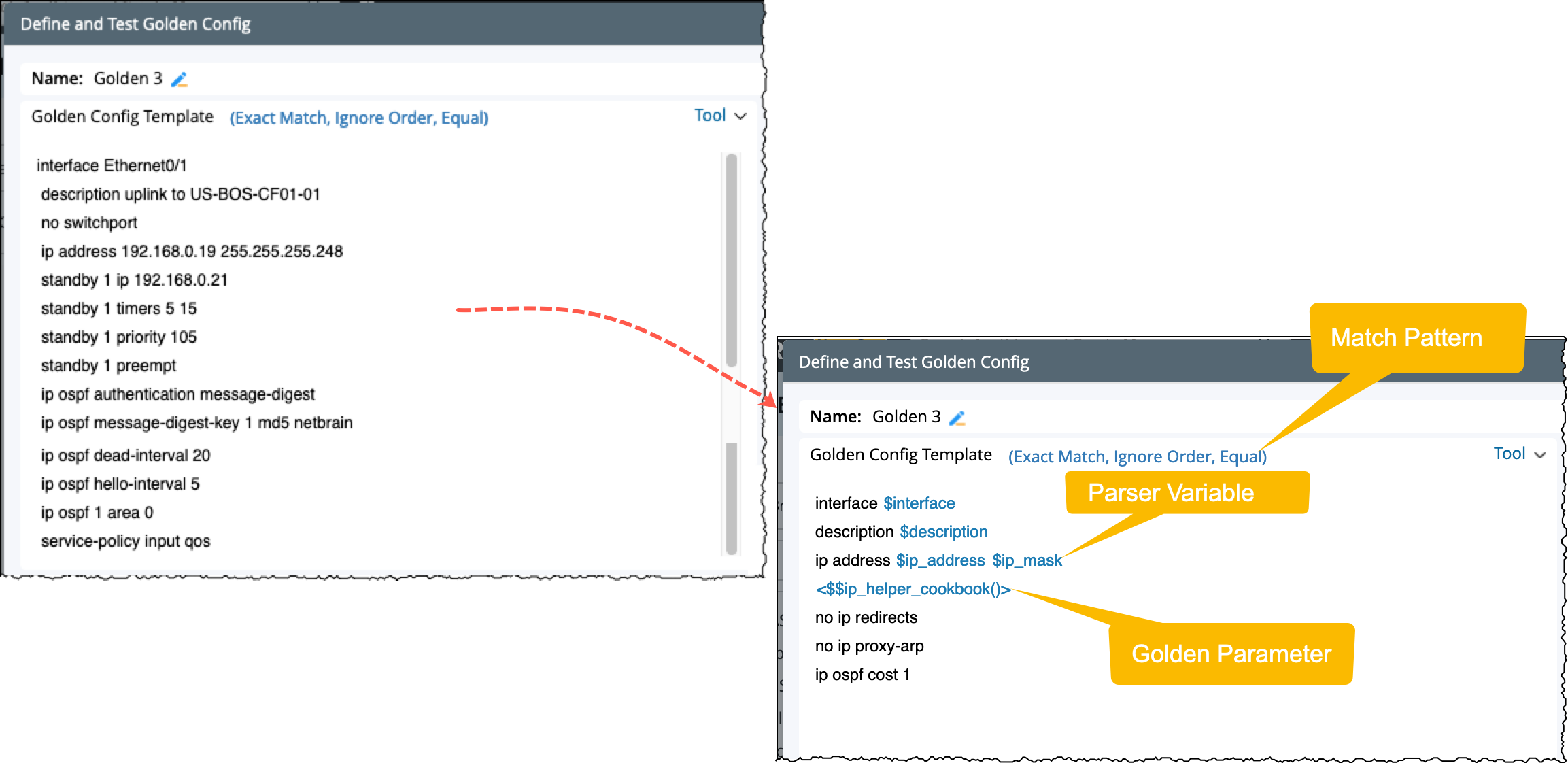Golden Config Template: While creating the Golden Config, the configuration data is brought over for adjustments. And you can replace the data with parameters/variables to enhance the template matching capability: