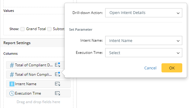- Define the Drill-down Action as below: Set the Drill-down Action to be Open Intent Details, and set the parameter to be Intent Name.