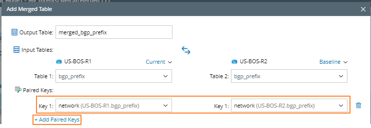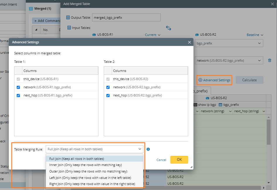 Merged Table can merge two tables in the same NI into one table, allowing you to merge table data in more ways to meet different needs. For example, there are two tables about BGP prefixes of primary and secondary wan routers, you can define merging rule to find the mismatched BGP route entries between them.