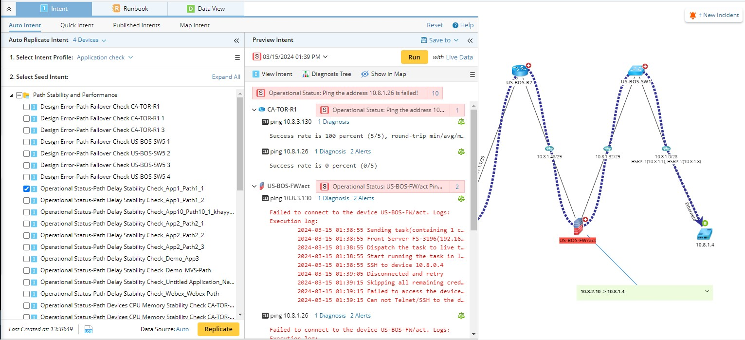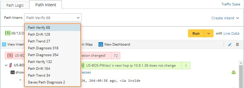 You can define an intent for a path, called the Path Intent. You can use Path Intent to document the baseline data and define the diagnosis logic for a path to achieve more efficient troubleshooting. Once network issues occur, the predefined path intent can be triggered to execute by the TAF (Trigger Automation Framework), Auto Intent or executed manually to diagnose the network problem. One path can have one or more associated path intents. The built-in path intent is directly stored in the path object.