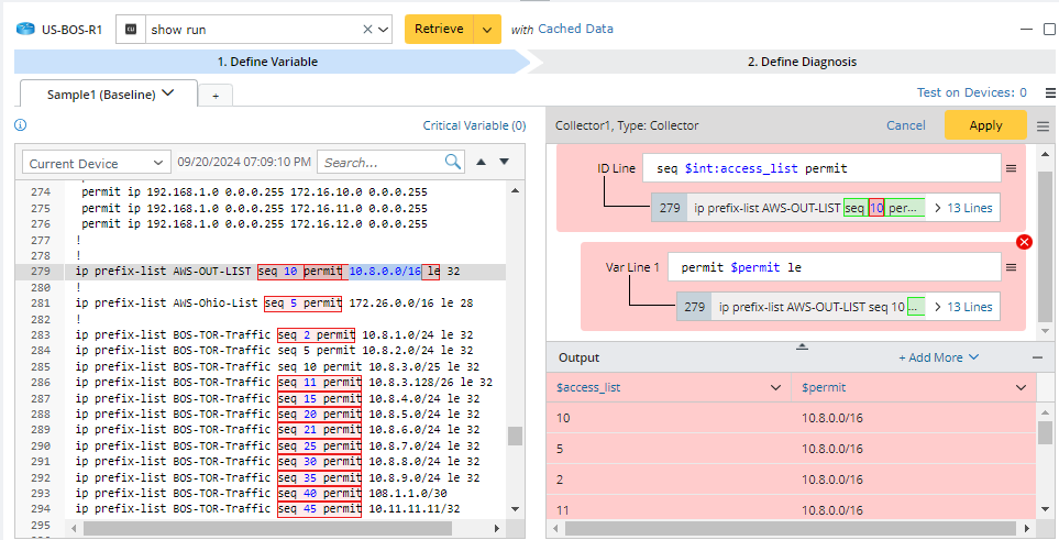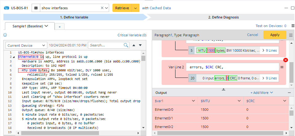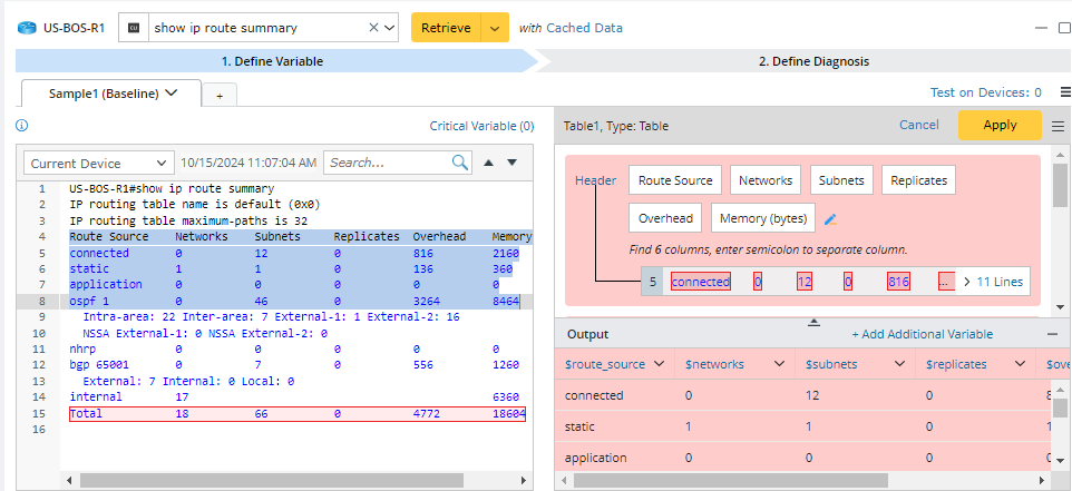 On the Define Variable tab for intent diagnosis creation, you can define different parsers, which will parse different variables. Add Parser from the Config and CLI command section and define the variables via Visual Parser. Visual Parser supports five types of variable definitions: Single Variable, Table, Paragraph, Collector, and Json Table. You can also directly click Auto Pattern to define a new parser via the auto parser function. See Add-on Parser for more details.