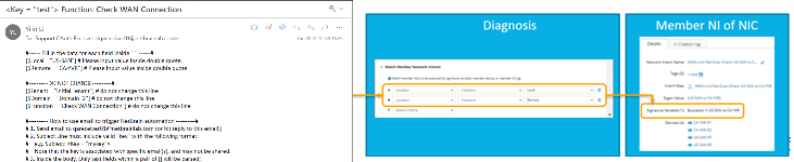 For this example, the value of the data field Local and Remote will be used in Static Diagnosis to find the relevant Member NI of the NIC. Only the Member NIs with the tag Location containing US-SAN or CA-YVR will be triggered by this Email. - NetBrain System executes the diagnosis and replies to the end-users with the results.