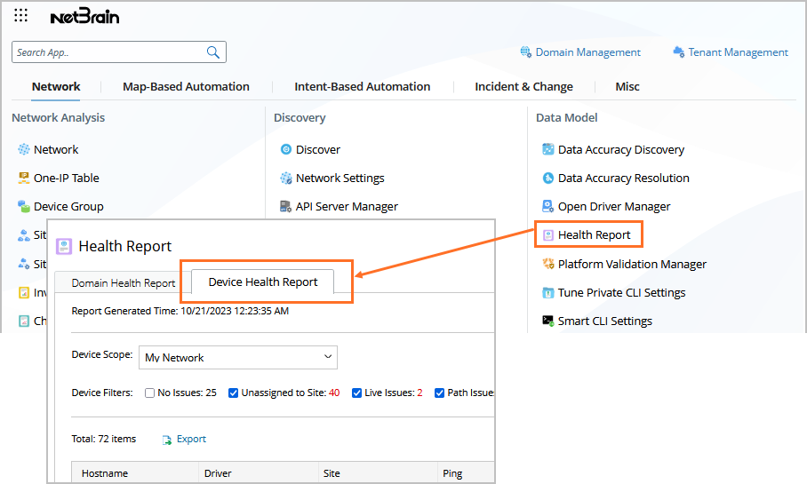 When working on a map, you may run into various anomalies of devices, such as a live access issue, a topology issue, or a path calculation failure across a device. Device Health Report provides device-level health status to help with map success.