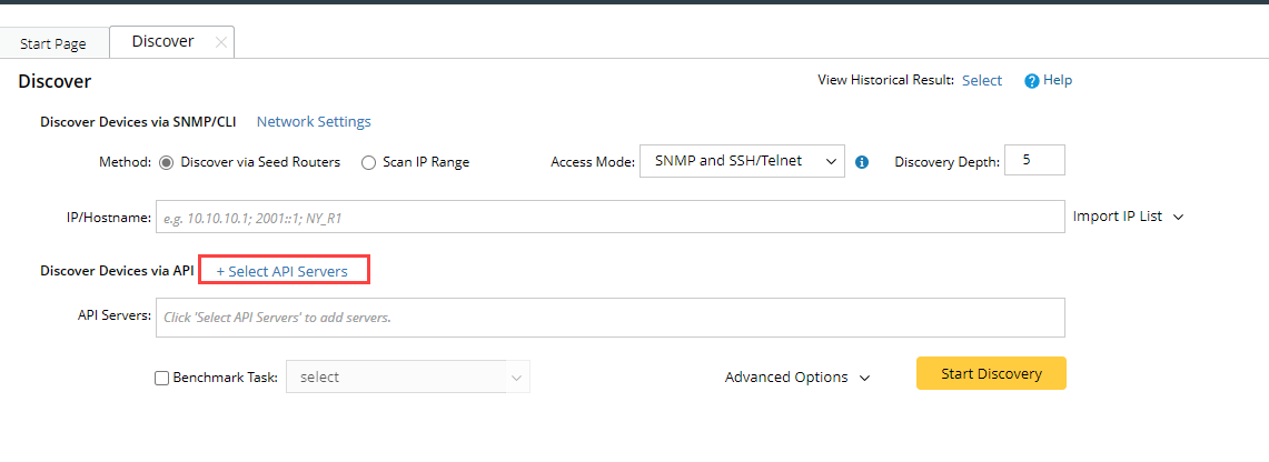 start menu and select Discover from the drop-down list. - In the Discover Devices via API area, click Select API Servers.