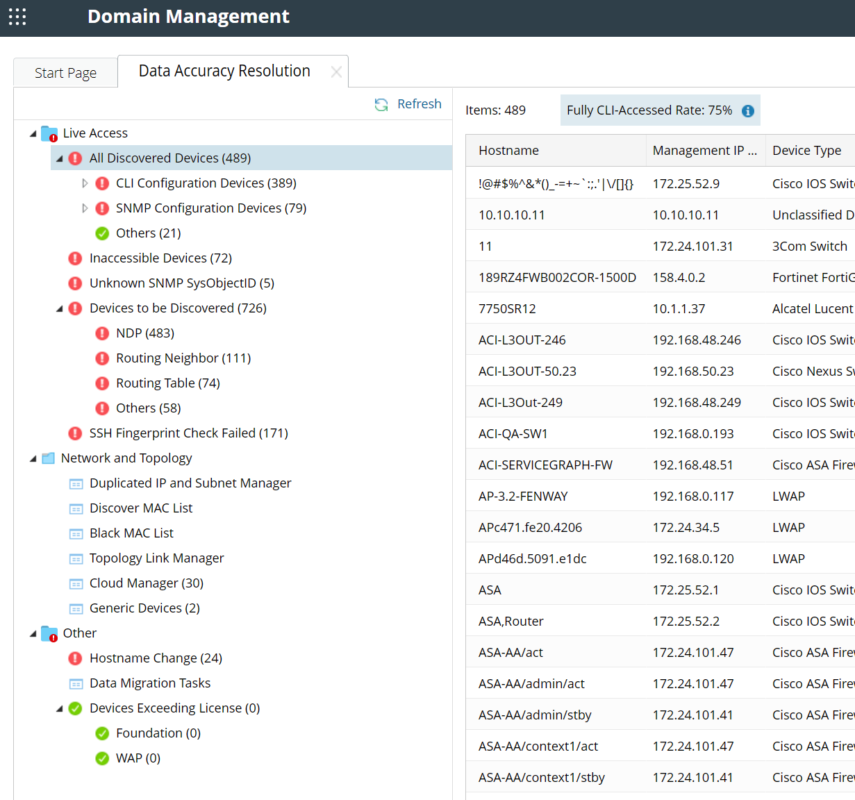 Data Accuracy Resolution provides an overview of how devices are discovered and where you can get started to fix all the access issues. The devices listed in each category are updated as soon as a discovery task or a benchmark task is completed, including both the on-demand and scheduled discovery/benchmark. It's recommended to check and maintain the Data Accuracy Resolution at least once a week or whenever a discovery/benchmark task is completed.