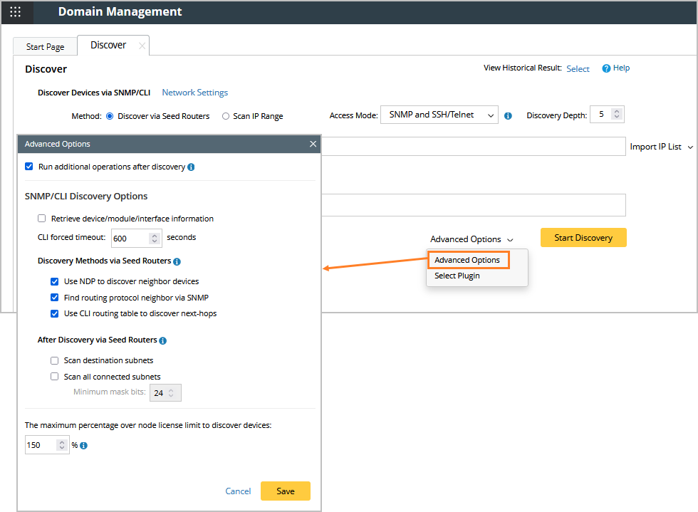 Sometimes it is hard to determine the amount of license required to discover your network due to the expansion or change of the network. Therefore, even if you do not have enough license nodes for the domain, NetBrain allows you to discover the network devices over the node limit. Go to Domain Management > Discover > Advanced Options to set relevant settings (e.g., you can set that the devices are discovered if 10% of license nodes are over license limit). The devices discovered after exceeding the license limit are not directly added to your domain, but they will be recorded in a table to help decide the extra license needed.