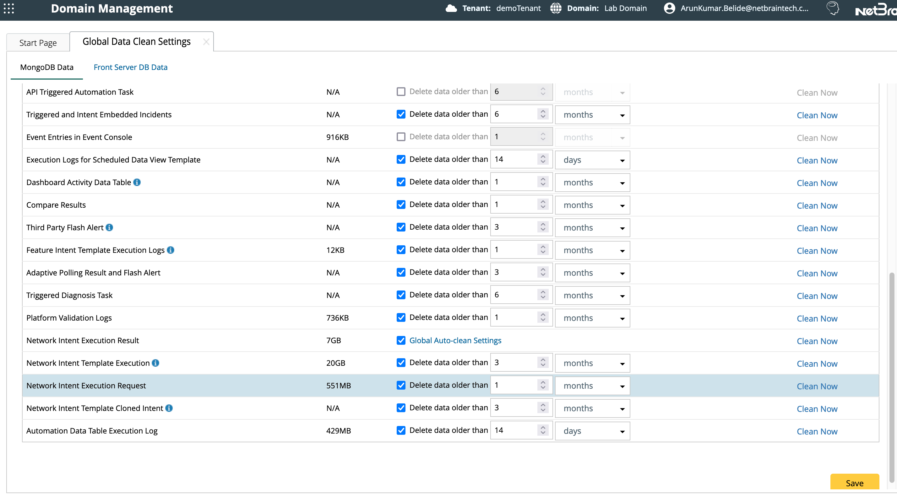 To avoid performance problems caused by more and more intent execution data, auto-clean the intent execution request in the Domain Management page > Global Data Clean Settings. This logic is enabled by default, and the default time is 1 month.