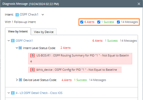 - You can select the following three check boxes to view only the alert status codes, success status codes, or diagnosis messages.