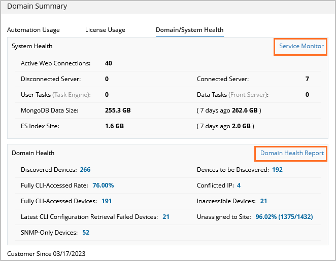 The Doman Health or System Health tab offers the System Health and Domain Health status.