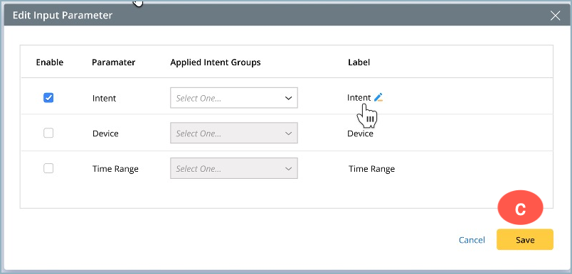 - Choose Edit Input Parameter from the drop-down menu of the selected intent template in Dashboard Manager. A window pops up for you to modify the parameters.